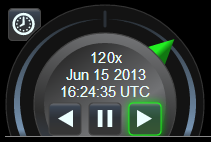 动画小部件提供播放、暂停和后退按钮以及当前时间和日期,周围环绕着用于控制动画速度的"穿梭环"。